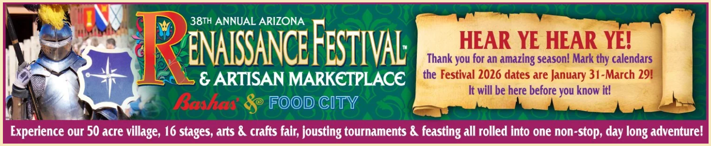 The 2026 AZ Renaissance Festival will run from January 31 – March 29.  It will be open Saturdays, Sundays, and Presidents’ Day.