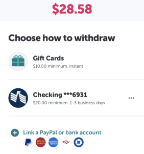 - Need to hit $10 before cashing out for a gift card, $20 for a bank deposit