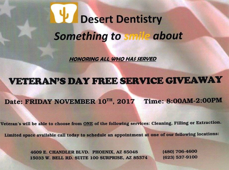 Get FREE dental service from Desert Dentistry in Ahwatukee or Surprise on November 10 from 8am-2pm, if you’re a vet.
