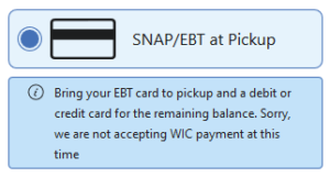 During the Covid-19 crisis, they are accepting EBT SNAP payments, but only in select regions.  If your area is accepting them, you will see it as a payment option when you put something in your cart and begin the checkout process.  (Test it before investing too much time, if you can’t pay another way.)  You will need to bring your EBT card for pickup, along with a credit or debit card to cover any remaining balance.  I’m guessing this will continue beyond this time period, but I’m not 100% sure yet.