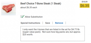 I put that I only wanted firm grapes and to skip them if they weren’t.  If you want your meat or cheese sliced a certain way, let them know.  If you’re unsure if something is counted by the pound or each, clarify in the notes.  I’m not sure why, but I couldn’t find the advertised price on a T-Bone value pack, which was in their ad.  I put the single steak in my cart and made a note that I only wanted the $4.77/lb super value pack steaks.  Since I didn’t know the size, I just gave them an approximate amount I wanted to spend.  They are very well trained and accommodating for special requests.