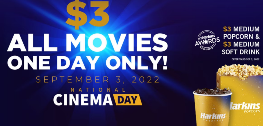 Saturday, September 3, is National Cinema Day. At most (all?) theaters around here, you can see $3 movies — all formats, all shows, all times! Most are also offering some food deals. I’ll share some screenshots of offers I know about below at each theater. For full details, check out their websites or social media.… Read More »