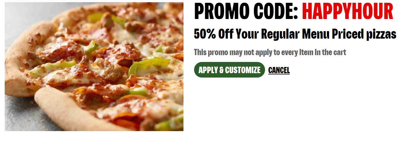 Get 50% off by using promo code 1652az1 on online orders of regular priced Papa John’s Pizza. Enter code for each pizza.
